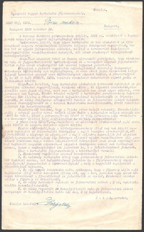 1919 Kézi aláírással hitelesített másolat 1919. novemberéből, amelyben a Tanácsköztársaság bukása után a budapesti főparancsnokság megtiltja a katonai egységeknek az önhatalmú rekvirálásokat, jó állapotban, 1p