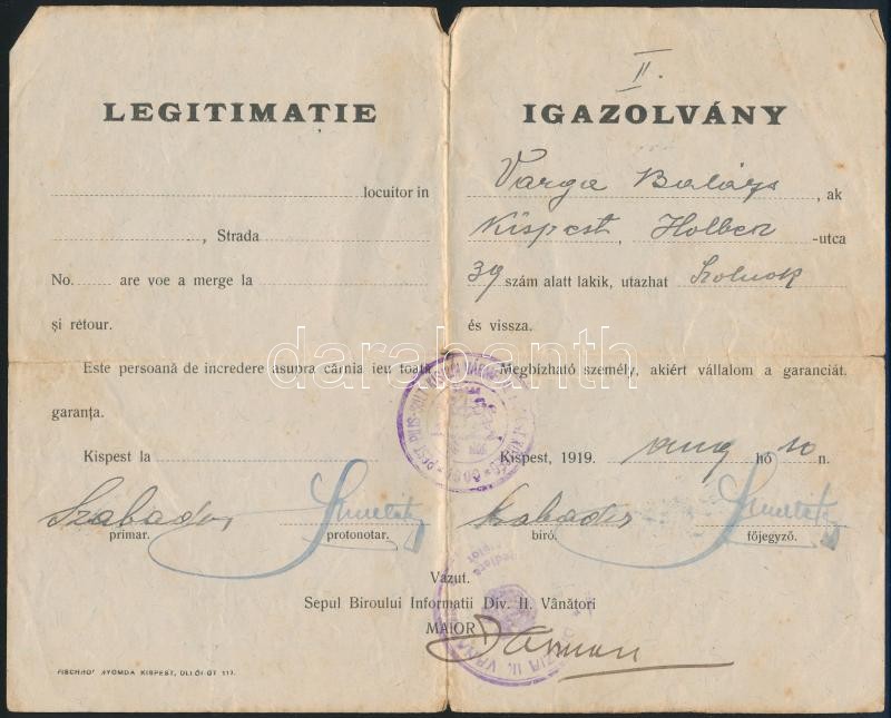 1919 Kispest, a román megszálló hatáság által a megszállása után mindössze 6 nappal utazáshoz kiállított igazolvány, Kispest község és a román hatóság bélyegzőjével