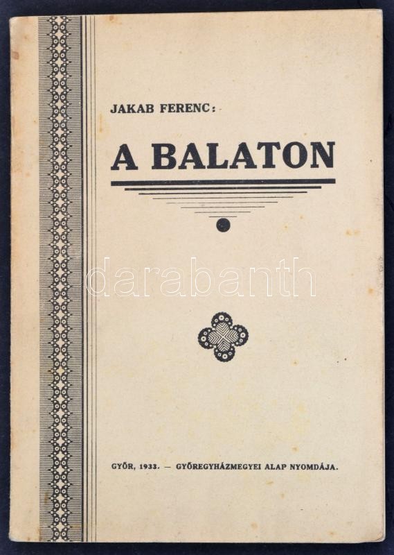Jakab Ferenc: A Balaton. Győr, 1933, Győregyházmegyei Alap Nyomdája. F... https://www.darabanth.com/de/354-Fernauktion/354.0/Kunst-Dokumente-andere-Sammelgebiete/Schiffe-Plattensee~500027/Jakab-Ferenc-A-Balaton-Gyor-1933-Gyoregyhazmegyei-Alap-Nyomdaja-Fekete-feher-kepekkel-Pa~II2018278