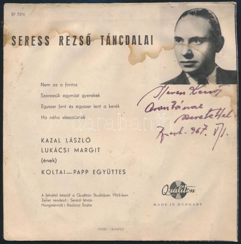 1967 Seress Rezső (1889-1968) zeneszerző, zongorista autográf sorai és aláírása egy bakelit lemez borítóján, (Szeressük egymást gyerekek!), dátumozva, a borító foltos.