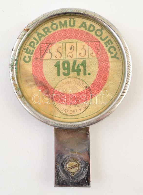 1941 Gépjárómű adójegy krómozott fém tartóval. d:10,5 cm https://www.darabanth.com/de/354-Fernauktion/354.0/Philatelie-und-Postgeschichte-Ungarn/Stempelmarken~500017/1941-Gepjaromu-adojegy-kromozott-fem-tartoval-d10-5-cm~II2022383