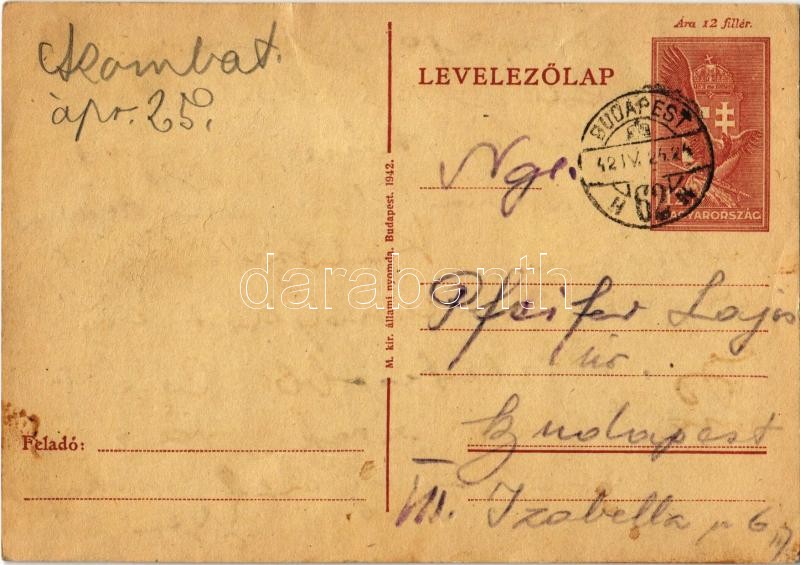 1942 Pfeifer György KMSZ (közérdekű munkaszolgálatos) levele családjának a munkatáborból. Pfeifer Lajosnak címezve / WWII Letter of a Jewish labor serviceman to his family from the labor camp. Judaica (EK)