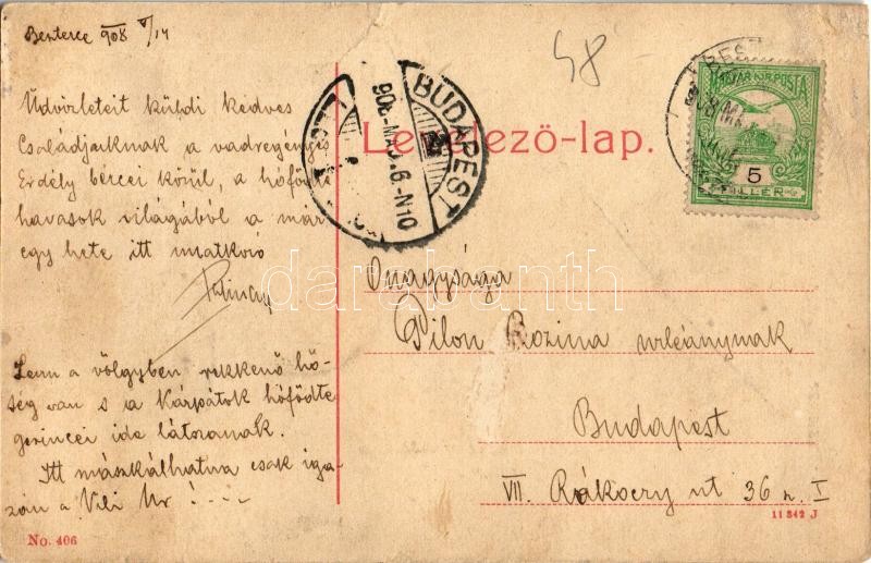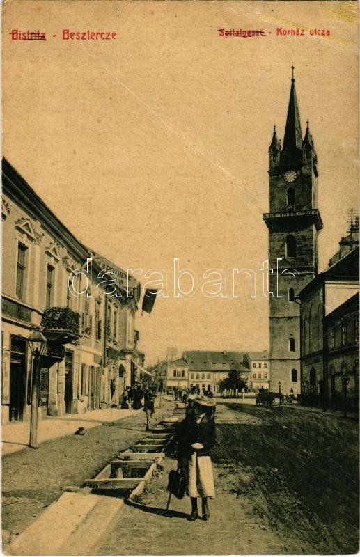 1908 Beszterce, Bistritz, Bistrita; Kórház utca, Gyógyszertár, Weiss Otto üzlete, Evangélikus templom. W. L. (?) No. 406. / street view, pharmacy, shops, Lutheran church (r)