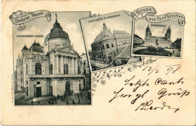 1898 Pécs, Magyar Nemzeti Színház, Kereskedelmi és Iparkamara, Székese... https://www.darabanth.com/de/355-Fernauktion/355.0/Ansichtskarten/Ungarn~1000005/1898-Pecs-Magyar-Nemzeti-Szinhaz-Kereskedelmi-es-Iparkamara-Szekesegyhaz-Kiadja-Gunsberge~II2031962