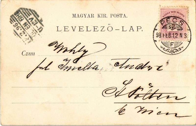 Beschreibung: 1898 Pécs, Magyar Nemzeti Színház, Kereskedelmi és Iparkamara, Székesegyház. Kiadja Günsberger Lajos. Art Nouveau, floral (EK)