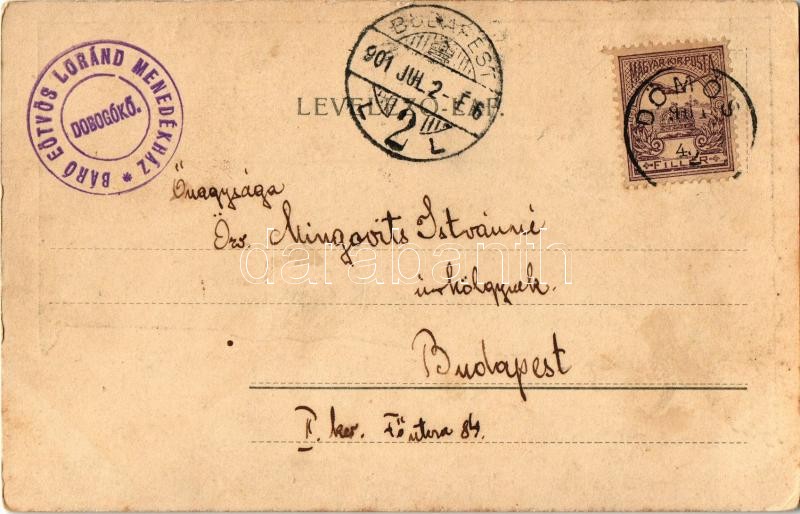 1901 Dobogókő (Pilisszentkereszt), Báró Eötvös Loránd menedékház, Thir... https://www.darabanth.com/de/355-Fernauktion/355.0/Ansichtskarten/Ungarn~1000005/1901-Dobogoko-Pilisszentkereszt-Baro-Eotvos-Lorand-menedekhaz-Thirring-szikla-eszaki-~II2031556