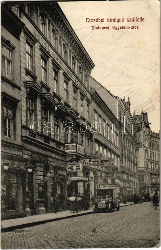 1911 Budapest V. Egyetem utca, Hotel Erzsébet királyné szálloda és étt... https://www.darabanth.com/de/355-Fernauktion/355.0/Ansichtskarten/Ungarn~1000005/1911-Budapest-V-Egyetem-utca-Hotel-Erzsebet-kiralyne-szalloda-es-etterem-svajci-ora-uzle~II2029725