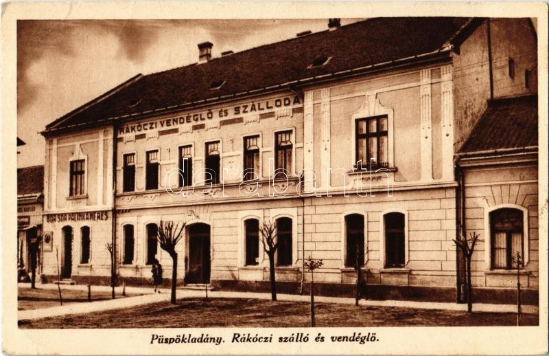 Beschreibung: 1936 Püspökladány, Rákóczi szálloda és vendéglő, étterem, bor, sör és pálinka mérés (EB)