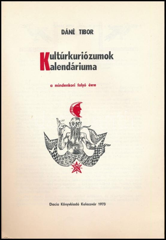 Dané Tibor: Kultúrkuriózumok kalendáriuma a mindenkori folyó évre. Kol... https://www.darabanth.com/de/355-Fernauktion/355.0/Bucher/Bucher-Andere-kuriositaten~1500019/Dane-Tibor-Kulturkuriozumok-kalendariuma-a-mindenkori-folyo-evre-Kolozsvar-1973-Dacia-Ki~II1996252