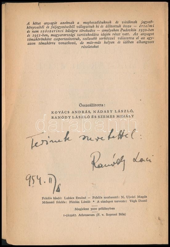 Pudovkin: A magyar filmről. Sajtó alá rendezte: Kovács András. Bp.,1952, Művelt Nép. Kiadói papírkötésben, sérült gerinccel. Ranódy László (1919-1983) Kossuth-díjas filmrendező, főiskolai tanár, forgatókönyvíró, díszlettervező ajándékozási soraival.