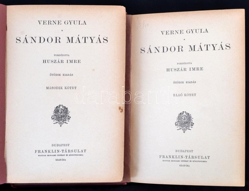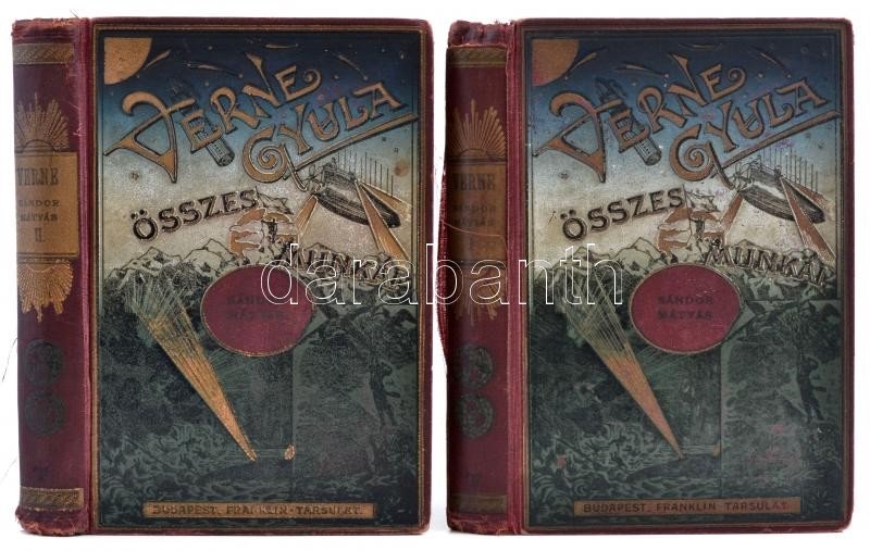 Verne Gyula: Sándor Mátyás I-II. köt. Fordította Huszár Imre. Verne Gyula összes munkái. Bp.,é.n., Franklin. Ötödik kiadás. Szövegközti illusztrációkkal. Kiadói illusztrált egészvászon-kötés, kopott borítókkal.
