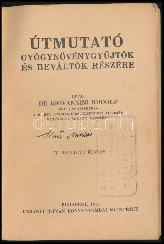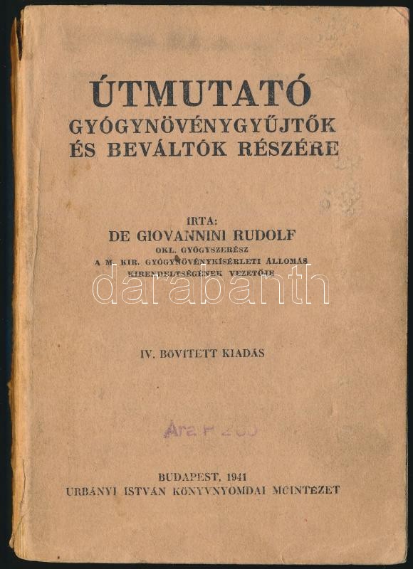 De Giovannini Rudolf: Útmutató gyógynövénygyűjtők és váltók részére. Bp.,1941, Urányi István, 224 p. + 16 t. (Színes képek.) Negyedik kiadás. Kiadói papírkötés, kissé szakadt borítóval.