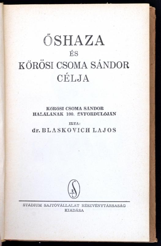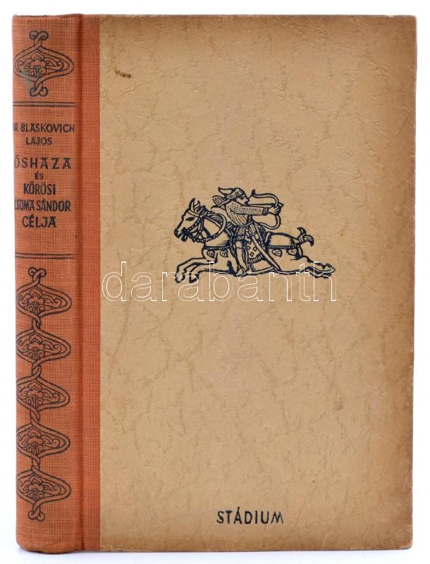 Dr. Blaskovich Lajos: Őshaza és Kőrösi Csoma Sándor célja. Körösi Csoma Sándor halálának 100. évfordulóján. Bp., (1942), Stádium Sajtóvállalat Rt., 230 p. + 8 t. Kiadói félvászon kötésben, kis kopásnyomokkal.