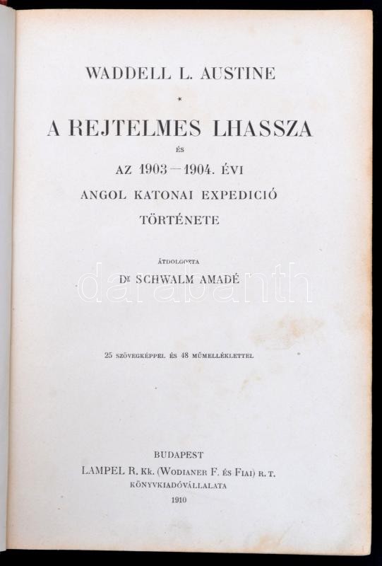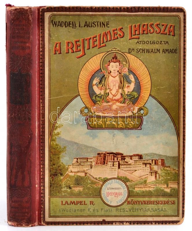 Waddell L. Austine: A rejtelmes Lhassza és az 1903-1904. évi angol katonai expedíció története. Átdolgozta Dr. Schwalm Amadé. Lóczy Lajos előszavával. Magyar Földrajzi Társaság könyvtára. Bp.,1910,Lampel R. (Wodianer F. és Fiai), VI+2+287+1 p.+42 t.( közte egy színes.)+ 3 kihajtható térkép. (Egy színes.) Szövegközti illusztrációkkal. Kiadói aranyozott, illlusztrált félvászon sorozatkötésben, kopott borítóval, hátul megerősített kötéssel.