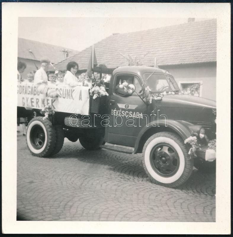 Beschreibung: cca 1960 "Legdrágább kincsünk a gyermek" - autós felvonulás a békéscsabai 8-as TEFU teherautón ülőkkel, 7,5×7,5 cm