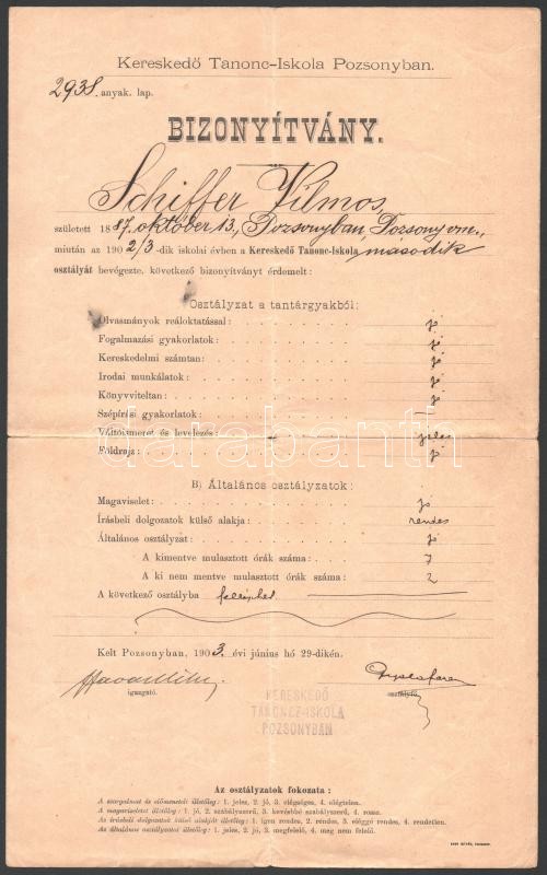1903 Pozsony, Kereskedő Tanonciskola által kiállított bizonyítvány https://www.darabanth.com/de/355-Fernauktion/355.0/Kunst-Dokumente-andere-Sammelgebiete/Dokument~500017/1903-Pozsony-Kereskedo-Tanonciskola-altal-kiallitott-bizonyitvany~II2028283