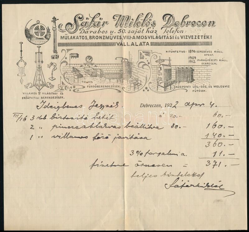 1922 Debrecen, Sáfár Miklós műlakatos, bronzműves, villamosvilágítási ... https://www.darabanth.com/de/355-Fernauktion/355.0/Kunst-Dokumente-andere-Sammelgebiete/Dokument~500017/1922-Debrecen-Safar-Miklos-mulakatos-bronzmuves-villamosvilagitasi-es-vizvezeteki-val~II2026880