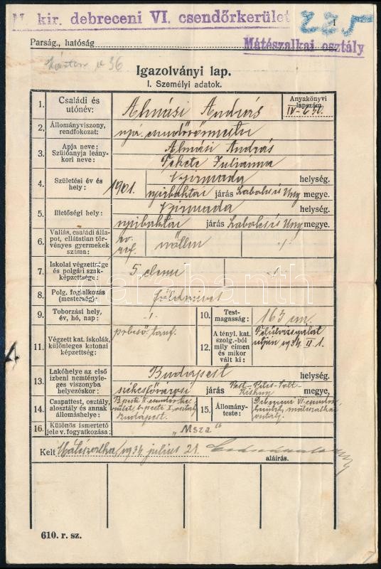 1934 Mátészalka, Igazolványi lap csendőrőrmester számára https://www.darabanth.com/de/355-Fernauktion/355.0/Kunst-Dokumente-andere-Sammelgebiete/Dokument~500017/1934-Mateszalka-Igazolvanyi-lap-csendorormester-szamara~II2029176