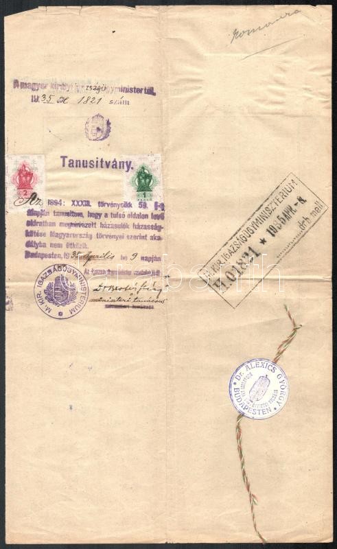 Beschreibung: 1935 Budapest, felmentés Magyarországon kívül kötendő házasság magyarországi bejelentése alól, okmánybélyegekkel