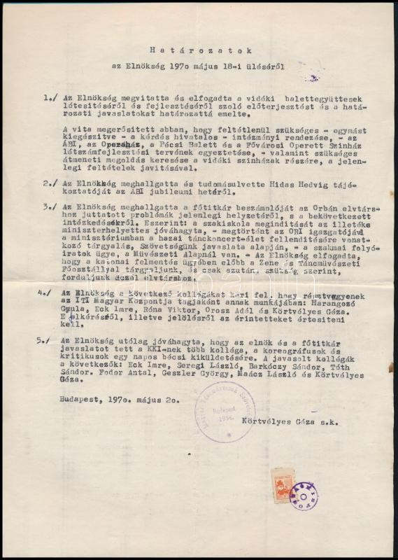 1970 a Magyar Táncművészek Szövetsége elnökségének határozata vidéki balettegyüttesek létesítéséről és fejlesztéséről, bélyegzővel, okmánybélyeggel + 2 db modern táncmotívumos levelezőlap