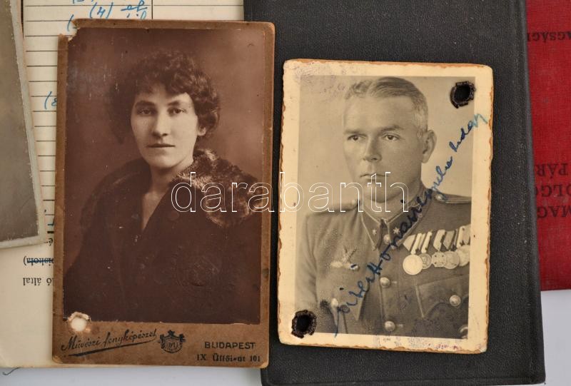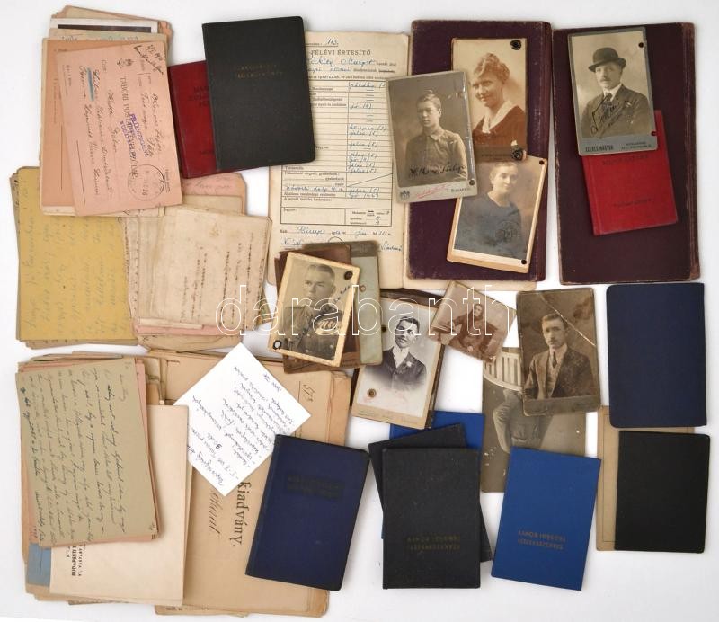 Vegyes papírrégiség tétel: levelek, tábori posta (30 db), igazolványok, bizonyítványok, képeslapok, fotók, adás-vételi szerződések, hiteles kiadványok, anyakönyvi kivonatok, szakszervezeti könyvek, reklámok, zárt levlapok