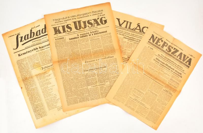 Beschreibung: 1945 Vegyes folyóirat tétel, Népszava 1945. márc. 3., Szabadság 1945. márc. 31., Világ 1945. aug. 24., Kis Ujság. aug. 24.