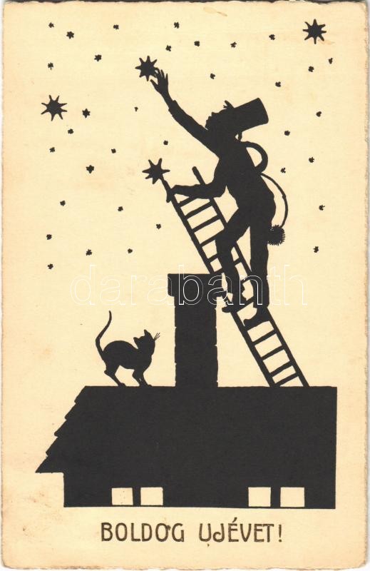 Boldog Újévet! / New Year greeting, chimney sweeper silhouette https://www.darabanth.com/de/356-Fernauktion/356.0/Ansichtskarten/GruC39Fkarten-Feste~1500068/Boldog-Ujevet-New-Year-greeting-chimney-sweeper-silhouette~II2043438