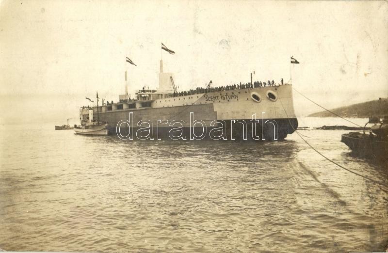 1914 Fiume (Rijeka), SMS Szent István osztrák-magyar Tegetthoff-osztályú csatahajó oldalvértezet nélküli vízre bocsátása / K.u.K. Kriegsmarine, launching of SMS Szent István without side armor. photo (fl)