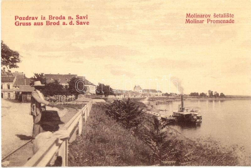 Beschreibung: Bród, Brod na Savi, Slavonski Brod; Molinarov setaliste / Molinar Promenade / Molinar sétány, gőzhajó. W. L. 145. / promenade, steamship