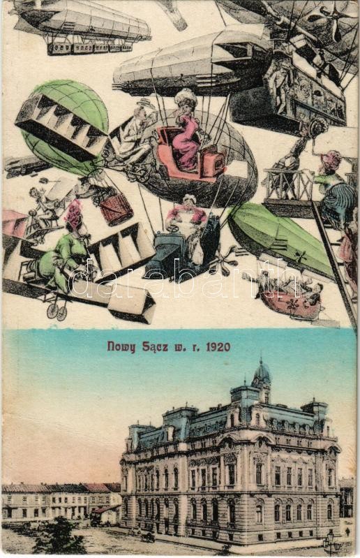 Beschreibung: 1914 Nowy Sacz, Nowego Sacza, Neu Sandez, Újszandec; a jövőben montázslap / Nowy Sacz w. r. 1920 / in the future montage postcard (EB)