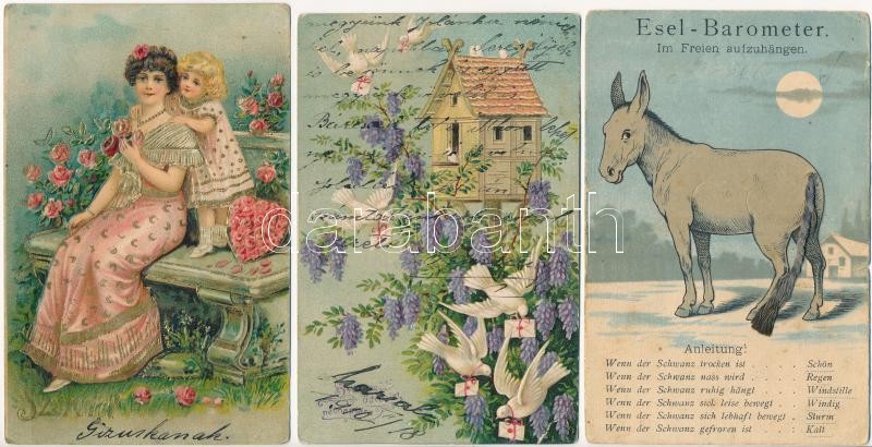 Beschreibung: 10 db főleg régi képeslap, közte dombornyomott, textil, litho, stb. / 10 mainly pre-1945 motive cards, including Emb., textile, litho, etc.
