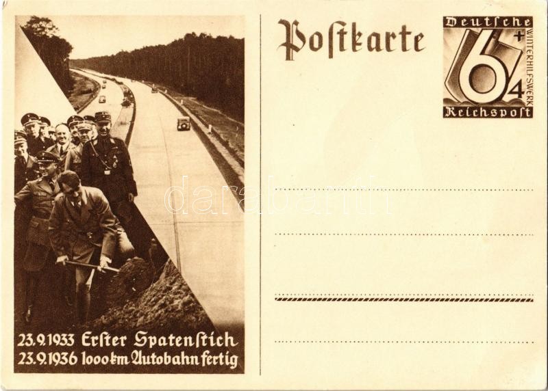 1933 Erster Spatenstich - 1936 1000 km Autobahn fertig / 1933 First Groundbreaking - 1936 1000 km highway completed. Adolf Hitler, NSDAP German Nazi Party propaganda. 6+4 Ga.