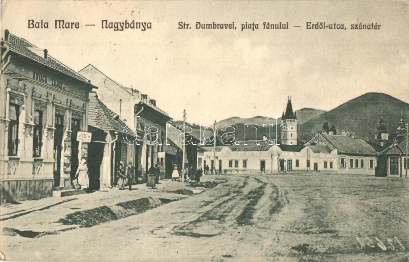 Nagybánya, Baia Mare; Str. Dumbravei, piata fanului / Erdői utca, Széna tér, Kovács Lajosné üzlete. Kiadja Kovács Gyula / street view, square, shops (EK)