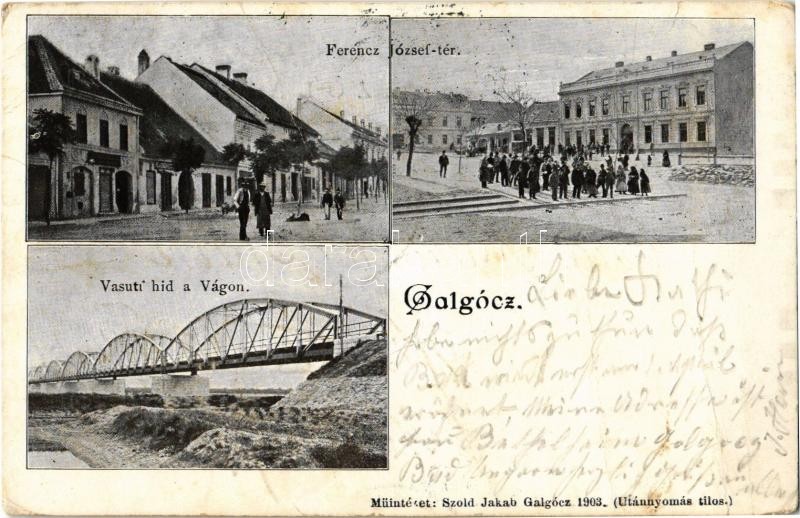 1903 Galgóc, Hlohovec; Ferenc József tér, üzletek, Vasúti híd a Vág folyó fölött. Kiadja Szold Jakab műintézete / square, shops, railway bridge over Váh river (fa)