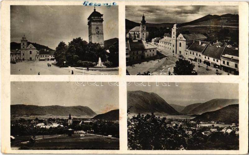 1943 Rozsnyó, Roznava; Rákóczi őrtorony magyar címerrel "Magyarok leszünk" irredenta felirattal, Fő tér, üzletek / watch tower with Hungarian coat of arms and irredenta propaganda, main square, shops (fl)