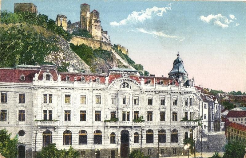 Beschreibung: Trencsén, Trencín; Tátra szálló a Váralján / Hotel Tatra with castle