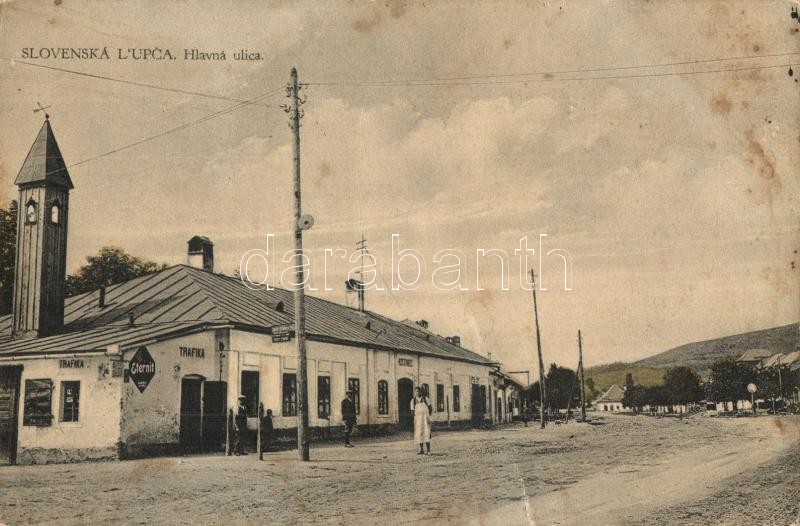 Zólyomlipcse, Slovenská Lupca; Hlavná ulica, Trafika, Hostinec. Nákladom Viliama Piaceka / Fő utca, vendéglő, étterem, üzlet Eternit reklámmal a falán, dohánybolt / main street, restaurant, inn, tobacco shop with advertisement poster (fa)