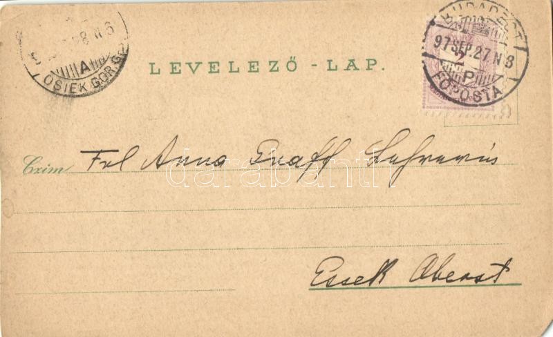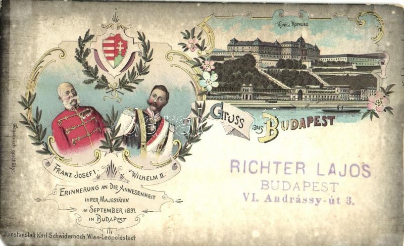 1897 Budapest, I. Ferencz József és II. Vilmos őfelségeiknek Budapesten való tartózkodásuk emlékéül a tatai hadgyakorlatok során. Királyi vár, Schwidernoch Károly floral, Art Nouveau litho (vágott / cut)