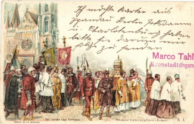1897 (Vorläufer!) Budapest I. Ezredéves Országos Kiállítás, Királyi vár, Mátyás templom, Szent István napi körmenet, litho barna 2 Kr. Ga. s: K. L. (EK)