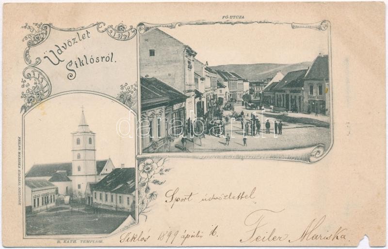 Beschreibung: 1899 Siklós, Fő utca, Pandurovits János, Paunz Géza üzlete, Római katolikus templom. Kiadja Feiler Mariska. Art Nouveau, floral (b)