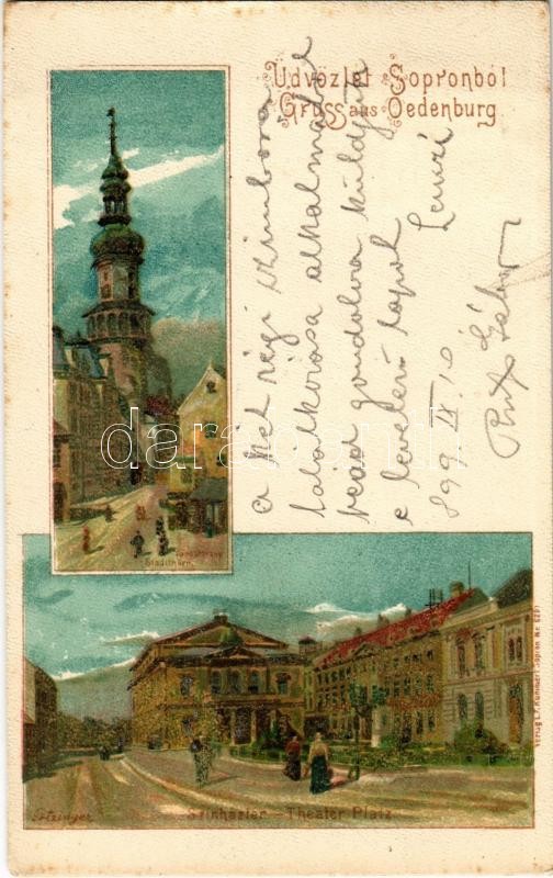 Beschreibung: 1899 Sopron, Oedenburg; Várostorony, Színház tér. L. F. Kummert Nr. 6201. litho s: Götzinger