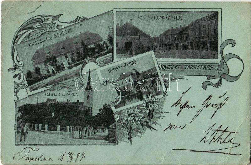 1899 Tapolca, Tapolcza; Vincellér képezde, iskola, Szentháromság tér, nagyvendéglő, étterem, üzletek, Templom és zárda, Tópart és fürdő. Art Nouveau, floral (EB)