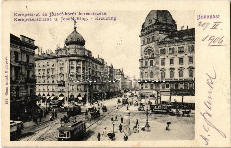 1906 Budapest VIII. Kerepesi út és József körút keresztezése (Blaha Lujza tér), Kartschmaroff A. féle drogéria (gyógyszertár), üzletek, Takarékpénztár, Zálogkölcsön Intézet, villamos. Ganz Antal 124.