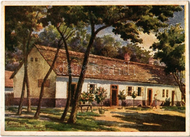 Beschreibung: 1935 Agárd (Gárdony), Gárdonyi Géza szülőháza; A magyar nemzet nagyjainak szülőházai festménysorozatból, művészlap s: Tibai-Takáts Jenő (vágott / cut)