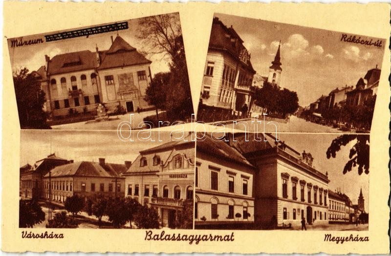 Balassagyarmat, Múzeum, Rákóczi út, Városháza, Megyeháza https://www.darabanth.com/de/356-Fernauktion/356.0/Ansichtskarten/Ungarn~1500005/Balassagyarmat-Muzeum-Rakoczi-ut-Varoshaza-Megyehaza~II2041085