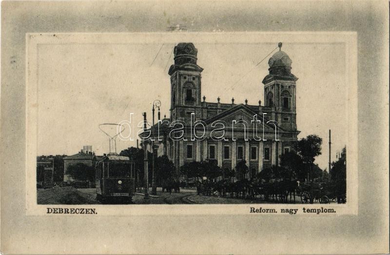 Debrecen, Református nagytemplom, villamos, lovaskocsik (r) https://www.darabanth.com/de/356-Fernauktion/356.0/Ansichtskarten/Ungarn~1500005/Debrecen-Reformatus-nagytemplom-villamos-lovaskocsik-r~II1974662