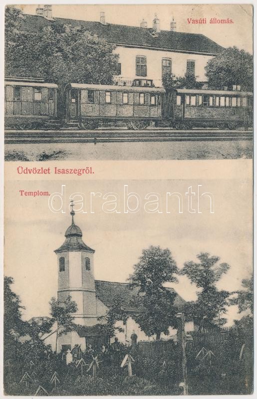 Isaszeg, vasútállomás vonattal, templom és temető (EK) https://www.darabanth.com/de/356-Fernauktion/356.0/Ansichtskarten/Ungarn~1500005/Isaszeg-vasutallomas-vonattal-templom-es-temeto-EK~II1938919