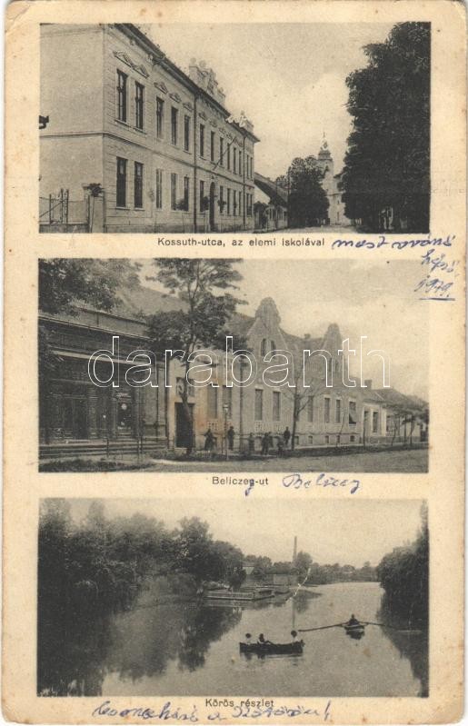 Beschreibung: Szarvas, Kossuth utca az elemi iskolával, Beliczey út, Gyógyszertár, Körös részlet, evezős csónak, fürdő (EB)
