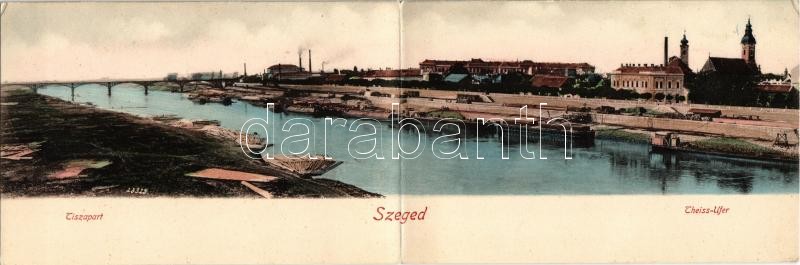 Beschreibung: Szeged. Tisza part, faúsztatás, rakpart uszályokkal / Theiss Ufer. panoramacard