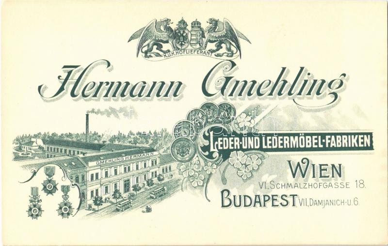 Hermann Gmehling's Leder und Ledermöbel-Fabriken / Hermann Gmehling bőr- és bőrbútorgyára Budapesten és Bécsben / advertisement card, leather and leather-furniture factory in Budapest and Wien. floral Art Nouveau
